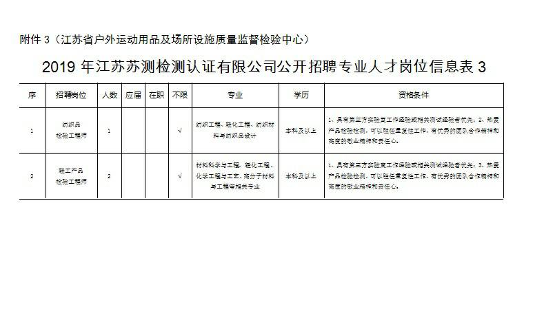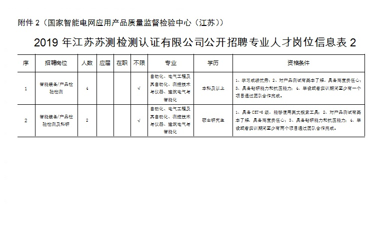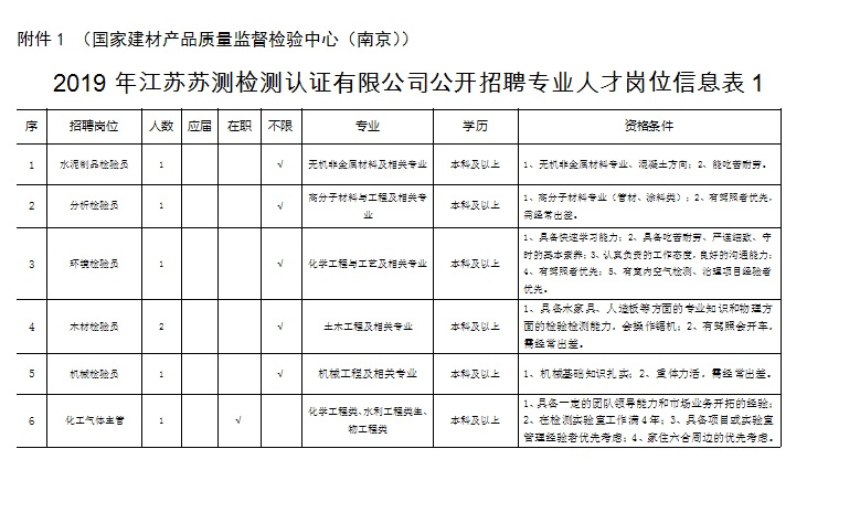 根據(jù)工作需要,江蘇蘇測檢測認(rèn)證有限公司(南京市產(chǎn)品質(zhì)量監(jiān)督檢驗(yàn)院全資子公司)委托中智江蘇經(jīng)濟(jì)技術(shù)合作有限公司面向社會公開招聘24名《2019年江蘇蘇測檢測認(rèn)證有限公司公開招聘專業(yè)人才公告》崗位工作人員,工作地點(diǎn)覆蓋南京市,確定聘用后根據(jù)工作需要統(tǒng)一安排,現(xiàn)將有關(guān)事項(xiàng)公告如下: 一、招聘崗位及人數(shù) 江蘇蘇測檢測認(rèn)證有限公司包括水泥制品檢驗(yàn)員、分析檢驗(yàn)員、環(huán)境檢驗(yàn)員、木材檢驗(yàn)員、機(jī)械檢驗(yàn)員、化工氣體主管、化工氣體檢驗(yàn)員、智能裝備/產(chǎn)品檢驗(yàn)檢測、智能裝備/產(chǎn)品檢驗(yàn)檢測及科研、紡織品檢驗(yàn)工程師、輕工產(chǎn)品檢驗(yàn)工程師等崗位共招聘24人。 二、資格條件 1.具有中華人民共和國國籍,擁護(hù)黨的路線、方針、政策; 2.遵紀(jì)守法,品行端正,具有良好的職業(yè)道德; 3.無違法違紀(jì)行為,具備正常履行工作職責(zé)的身體條件; 4.具備崗位資格條件(詳見附件:《2019年江蘇蘇測檢測認(rèn)證有限公司公開招聘專業(yè)人才崗位信息表》) 三、簡歷投遞方式 報(bào)名方式:本次招聘采取電子郵件報(bào)名方式。電子郵件報(bào)名時(shí),請將郵件主題及應(yīng)聘文檔按“2018年江蘇蘇測工作人員招聘材料+姓名+崗位”格式命名。 四、聘者需填寫個(gè)人簡歷或者附件5-《2019年江蘇蘇測檢測認(rèn)證有限公司勞務(wù)外包項(xiàng)目報(bào)名表》,并提交求職材料。求職材料包含:(1)登記表或個(gè)人簡歷上填寫內(nèi)容的證明材料(身份證、畢業(yè)證、學(xué)位證、職稱證、主要科研成果證明及獲獎證書等材料原件掃描件/復(fù)印件);(2)有海外學(xué)習(xí)工作經(jīng)歷的需提供留學(xué)回國證明、學(xué)歷認(rèn)證等材料原件掃描件/復(fù)印件。(3)應(yīng)聘崗位所需提供的其他材料原件及復(fù)印件。 應(yīng)聘者請將個(gè)人簡歷或者附件5-《2019年江蘇蘇測檢測認(rèn)證有限公司勞務(wù)外包項(xiàng)目報(bào)名表》及應(yīng)聘證明材料原件掃描并制作成一份PDF格式材料后,發(fā)送至郵箱:617025593@qq.com,相關(guān)咨詢電話:025-86673817 凌老師(工作日9:00-17:00,節(jié)假日除外)。 五、資格審查 1.初審。根據(jù)應(yīng)聘者提供的各種求職材料進(jìn)行資格審查,應(yīng)聘者提供的應(yīng)聘材料須真實(shí)準(zhǔn)確,一經(jīng)發(fā)現(xiàn)應(yīng)聘材料存在虛假不實(shí)之處,經(jīng)核實(shí),取消應(yīng)聘者應(yīng)聘資格,責(zé)任由應(yīng)聘人員自行承擔(dān)。 2.復(fù)審?,F(xiàn)場對初審合格的應(yīng)聘者提供的各種求職材料原件進(jìn)行資格審查,交驗(yàn)證明材料原件。符合要求的準(zhǔn)許參加面試,不符合要求的取消其面試資格。 六、筆試、面試 符合資格審查的候選人,將統(tǒng)一組織開展筆試、面試,進(jìn)行擇優(yōu)選取。 七、體檢、錄用 根據(jù)崗位需要,經(jīng)考試、政審、體檢合格后確定聘用候選人。通過中智江蘇經(jīng)濟(jì)技術(shù)合作有限公司實(shí)行勞務(wù)外包管理。