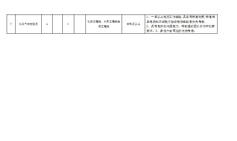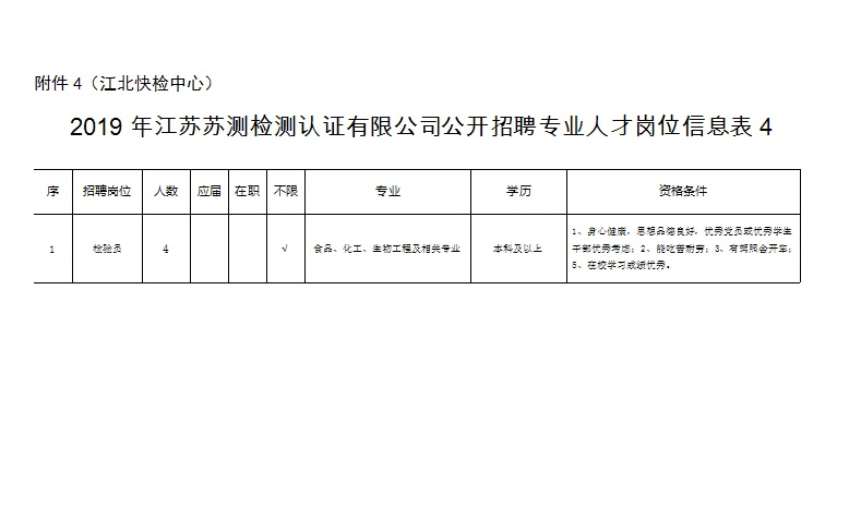 根據(jù)工作需要,江蘇蘇測檢測認(rèn)證有限公司(南京市產(chǎn)品質(zhì)量監(jiān)督檢驗(yàn)院全資子公司)委托中智江蘇經(jīng)濟(jì)技術(shù)合作有限公司面向社會公開招聘24名《2019年江蘇蘇測檢測認(rèn)證有限公司公開招聘專業(yè)人才公告》崗位工作人員,工作地點(diǎn)覆蓋南京市,確定聘用后根據(jù)工作需要統(tǒng)一安排,現(xiàn)將有關(guān)事項(xiàng)公告如下: 一、招聘崗位及人數(shù) 江蘇蘇測檢測認(rèn)證有限公司包括水泥制品檢驗(yàn)員、分析檢驗(yàn)員、環(huán)境檢驗(yàn)員、木材檢驗(yàn)員、機(jī)械檢驗(yàn)員、化工氣體主管、化工氣體檢驗(yàn)員、智能裝備/產(chǎn)品檢驗(yàn)檢測、智能裝備/產(chǎn)品檢驗(yàn)檢測及科研、紡織品檢驗(yàn)工程師、輕工產(chǎn)品檢驗(yàn)工程師等崗位共招聘24人。 二、資格條件 1.具有中華人民共和國國籍,擁護(hù)黨的路線、方針、政策; 2.遵紀(jì)守法,品行端正,具有良好的職業(yè)道德; 3.無違法違紀(jì)行為,具備正常履行工作職責(zé)的身體條件; 4.具備崗位資格條件(詳見附件:《2019年江蘇蘇測檢測認(rèn)證有限公司公開招聘專業(yè)人才崗位信息表》) 三、簡歷投遞方式 報(bào)名方式:本次招聘采取電子郵件報(bào)名方式。電子郵件報(bào)名時(shí),請將郵件主題及應(yīng)聘文檔按“2018年江蘇蘇測工作人員招聘材料+姓名+崗位”格式命名。 四、聘者需填寫個(gè)人簡歷或者附件5-《2019年江蘇蘇測檢測認(rèn)證有限公司勞務(wù)外包項(xiàng)目報(bào)名表》,并提交求職材料。求職材料包含:(1)登記表或個(gè)人簡歷上填寫內(nèi)容的證明材料(身份證、畢業(yè)證、學(xué)位證、職稱證、主要科研成果證明及獲獎證書等材料原件掃描件/復(fù)印件);(2)有海外學(xué)習(xí)工作經(jīng)歷的需提供留學(xué)回國證明、學(xué)歷認(rèn)證等材料原件掃描件/復(fù)印件。(3)應(yīng)聘崗位所需提供的其他材料原件及復(fù)印件。 應(yīng)聘者請將個(gè)人簡歷或者附件5-《2019年江蘇蘇測檢測認(rèn)證有限公司勞務(wù)外包項(xiàng)目報(bào)名表》及應(yīng)聘證明材料原件掃描并制作成一份PDF格式材料后,發(fā)送至郵箱:617025593@qq.com,相關(guān)咨詢電話:025-86673817 凌老師(工作日9:00-17:00,節(jié)假日除外)。 五、資格審查 1.初審。根據(jù)應(yīng)聘者提供的各種求職材料進(jìn)行資格審查,應(yīng)聘者提供的應(yīng)聘材料須真實(shí)準(zhǔn)確,一經(jīng)發(fā)現(xiàn)應(yīng)聘材料存在虛假不實(shí)之處,經(jīng)核實(shí),取消應(yīng)聘者應(yīng)聘資格,責(zé)任由應(yīng)聘人員自行承擔(dān)。 2.復(fù)審?,F(xiàn)場對初審合格的應(yīng)聘者提供的各種求職材料原件進(jìn)行資格審查,交驗(yàn)證明材料原件。符合要求的準(zhǔn)許參加面試,不符合要求的取消其面試資格。 六、筆試、面試 符合資格審查的候選人,將統(tǒng)一組織開展筆試、面試,進(jìn)行擇優(yōu)選取。 七、體檢、錄用 根據(jù)崗位需要,經(jīng)考試、政審、體檢合格后確定聘用候選人。通過中智江蘇經(jīng)濟(jì)技術(shù)合作有限公司實(shí)行勞務(wù)外包管理。
